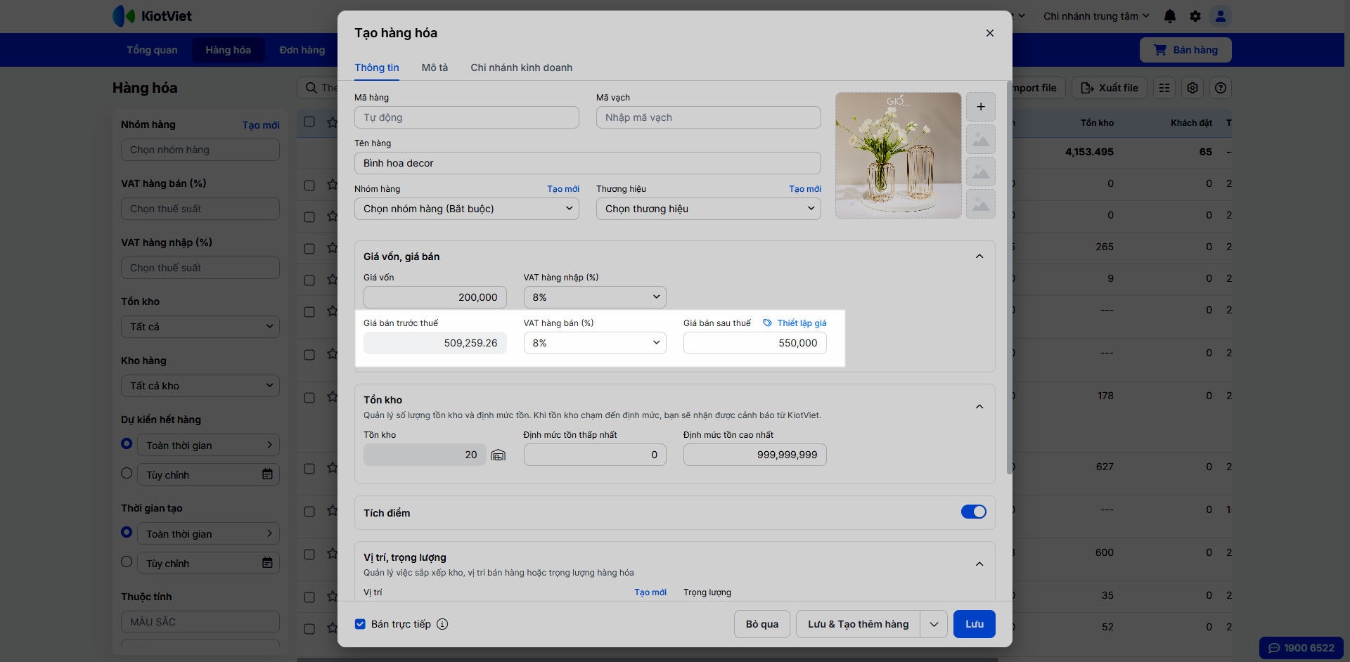 - Bạn cần nhập một sản phẩm vào hệ thống với giá bán cuối cùng đã có VAT là 550,000đ.
