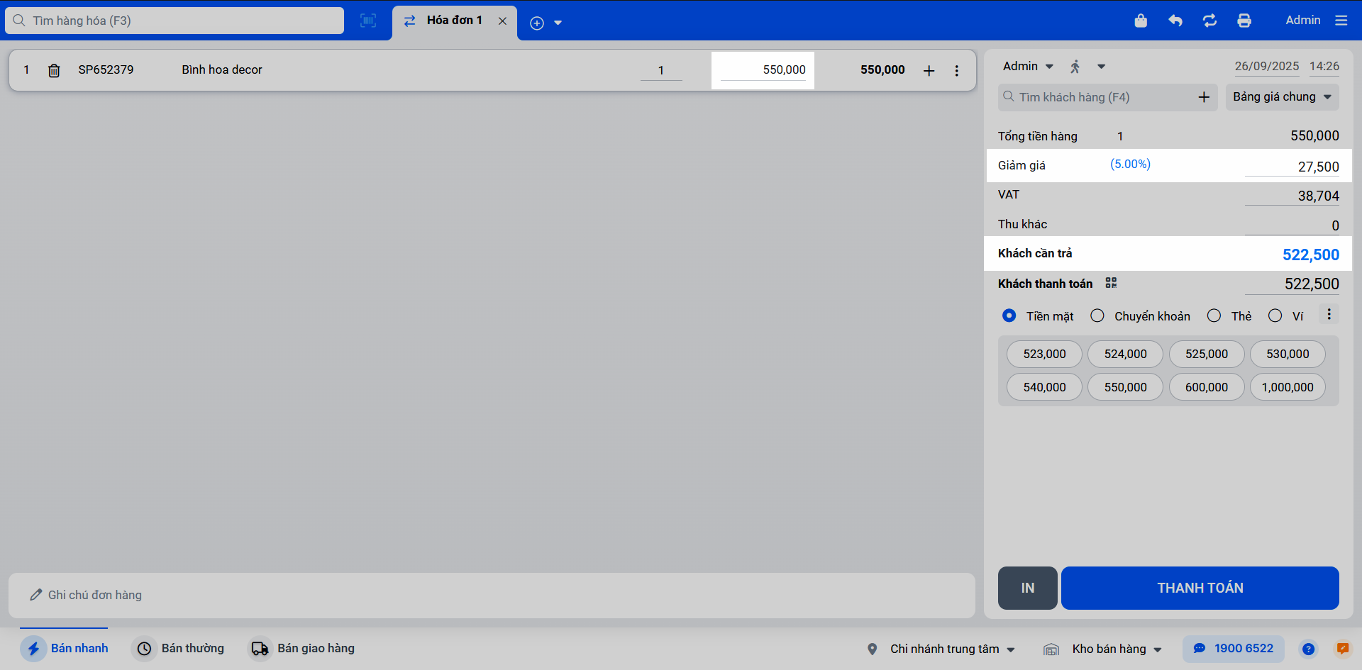 (3) Bảng tổng kết sẽ hiển thị Khách cần trả = Tổng tiền hàng (sau thuế) – Giảm giá (sau thuế).