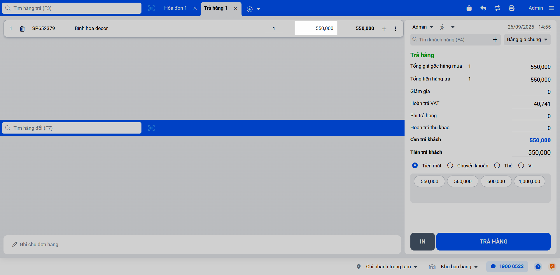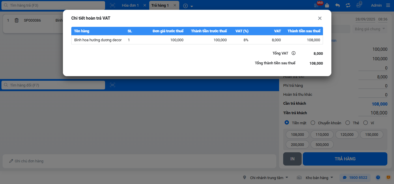 (2) Trả hàng nhanh: Hệ thống lấy đơn giá sau thuế hiện tại của sản phẩm để tính toán.