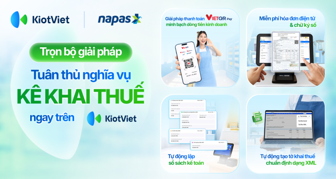 Để giải quyết bài toán này, xu hướng tất yếu là tự động hóa và chuẩn hóa dữ liệu bằng công nghệ. Trong đó, KiotViet mang đến giải pháp hỗ trợ kê khai thuế “tất cả trong một” trên phần mềm bán hàng, giúp hộ kinh doanh giảm tải công việc, hỗ trợ tuân thủ nghĩa vụ thuế và minh bạch trong quản lý tài chính.