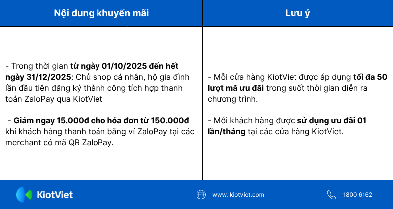 Điều kiện tham gia khuyến mãi: Áp dụng cho chủ shop cá nhân, hộ gia đình lần đầu tiên đăng ký thành công tích hợp thanh toán ZaloPay qua KiotViet trong thời gian từ 01/10/2025 - 31/12/2025.