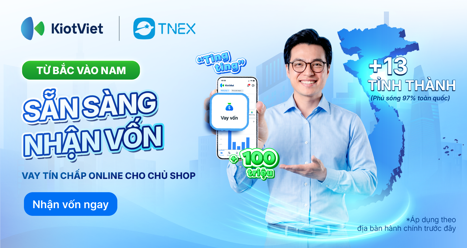Thấu hiểu điều đó, TNEX và KiotViet chính thức mở rộng giải pháp vay nhanh đến thêm 13 tỉnh từ Bắc vào Nam. Giải pháp vay tiêu dùng dành riêng cho chủ shop của TNEX giúp chủ shop có thể chủ động nhận vốn ngay trên ứng dụng KiotViet, với quy trình số hóa 100%, giải ngân tức thì và hoàn toàn không cần tài sản đảm bảo.