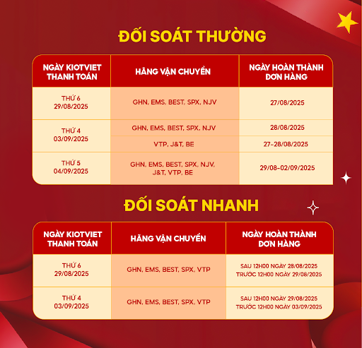 Công ty Cổ phần phần mềm KiotViet xin gửi tới Quý Khách hàng lời chào trân trọng. Chúng tôi xin phép gửi tới Quý khách hàng lịch vận hành kỳ Quốc Khánh 2/9 của các Đơn vị vận chuyển trên Phần mềm quản lý bán hàng KiotViet như sau